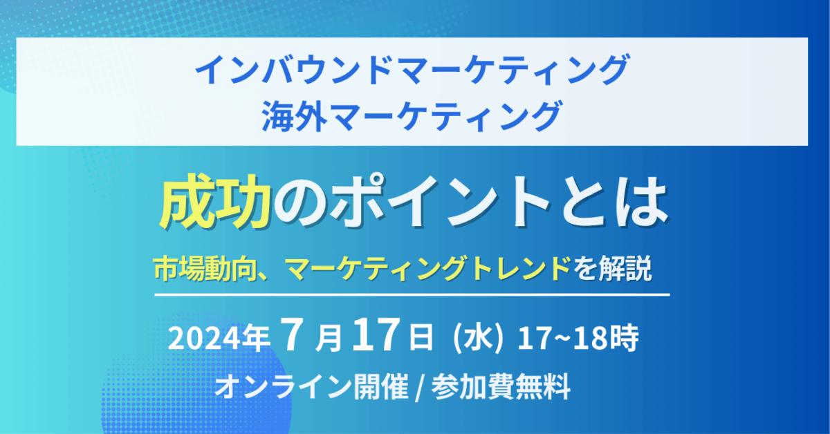 株式会社エイスリー(本社:東京都渋谷区、代表取締役CEO:高橋 太一、以下エイスリー)は、株式会社ビヨンド(本社:東京都江東区、代表取締役:道越 万由子、以下ビヨンド)とUUUM株式会社(本社:東京都港区、代表取締役 社長執行役員: 梅景 匡之、以下UUUM)と共に、「【インバウンド・海外マーケティング成功のポイントとは】市場動向、マーケティングトレンドを解説」と題したオンラインセミナーを、2024年7月17日(水)17~18時で開催いたします。