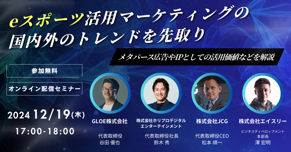 タレントドリブンマーケティングを主導する株式会社エイスリー(本社:東京都渋谷区、代表取締役CEO:高橋 太一、以下エイスリー)は、「eスポーツ活用マーケティングの国内外のトレンドを先取り、メタバース広告やIPとしての活用価値などを解説」と題したオンラインセミナーを、2024年12月19日(木)17時〜18時で開催いたします。ゲストスピーカーとして、GLOE株式会社(本社:東京都新宿区、代表取締役社長:谷田 優也、古澤 明仁、東証グロース:9565、以下GLOE)、株式会社ホリプロデジタルエンターテインメント(本社:東京都目黒区、代表取締役社長:鈴木 秀、以下ホリプロデジタル)、株式会社JCG(本社:東京都江東区、代表取締役CEO:松本 順一、以下JCG)の各社代表にご登壇いただきます。